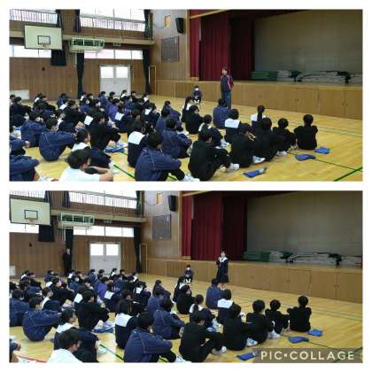 本日の2年生の学年集会では、先日に実施した「校外学習」の反省点として、「時間を守ることの大切さ」について再度確認をしました。当日、遅刻して予定が遅れる事態もあったので、3年生の修学旅行では、スムーズに事が運ぶようにみんなで意識し、協力していきましょう(^o^)また、学年代表からは、2月末に控えている学年末テストに向けて計画的に勉強していこうと話がありました。