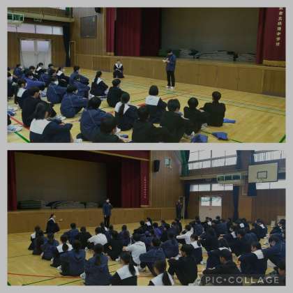 本日の集会では、全学年で実施する「ノーチャイムデー」についての話を風紀副委員長から話がありました。自分達で時間を気にしながら、行動してもらいたいと思います。また、学年副代表からは、来週から控えている「学年末テスト」に向けてと3年生に向けて来月を有意義に過ごそうと話がありました。