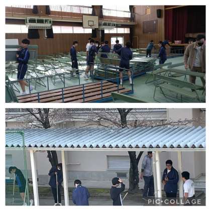 新年度になり、明日に控えている「入学式」に向けて、新2・3年生の学級委員と先生方で体育館の準備と清掃美化を担当しました。明日の新入生を迎える準備は万端です(^o^)