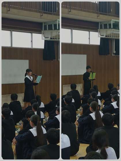 校長先生と平賀先生のお話と歓迎の言葉とよろこびの言葉の写真です。
