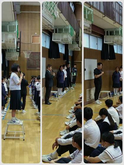 GW明け、天気は雨でしたが、体育館で全校集会を行いました。