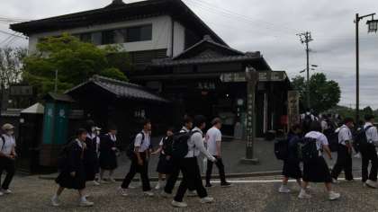 馬籠宿で班別行動です。おみやげを買ったり、食べ歩きを楽しんだりしました。