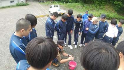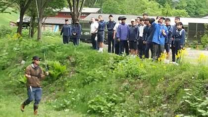インストラクターさんがお手本でニジマスを釣り上げました。