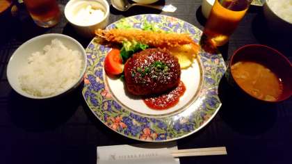リゾートホテルの夕食タイム。メインがハンバーグ、エビフライ、他に味噌汁、ヨーグルトです。