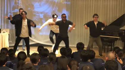 「ちょっと待った!」が入り先生5人による「○賀スタイル」のダンスが始まりました。