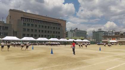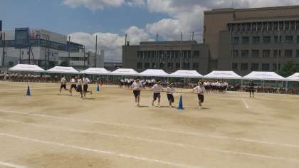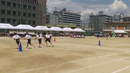 1年生学年種目「台風の目」です。遠心力が働いて大変です。