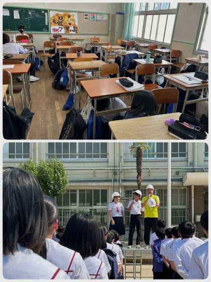 避難後、校長先生から地震のお話があり、地域から寄贈されたヘルメットの紹介もありました。最後に、各学年集会で予行した地域別の班に分かれる練習を行いました。