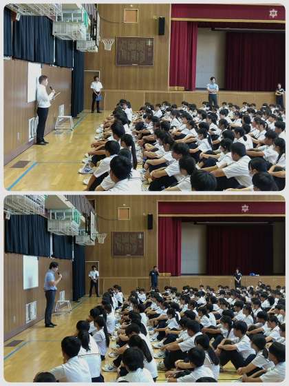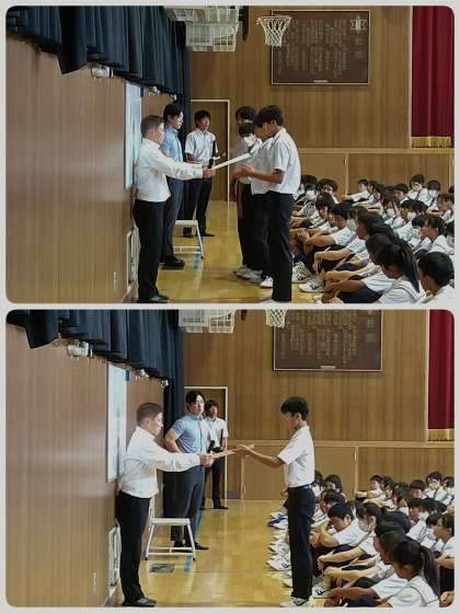 この夏休みに沢山の部活が活動し、その中で水泳部とハンドボール部が好成績を収め表彰がありました。その後、校長先生からは、夏休み中も含め、災害(地震、台風)について、防災意識を持って行動できるように、また、平賀先生からは事故や(教育)相談について話がありました。明日から授業が始まります。しっかり頑張っていきましょう!