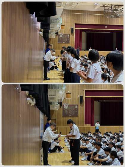 本日は、総合文化祭・美術の部と男子バスケットボールの選抜の表彰がありました。また、来週から3年生は実力テストが控えているので、自分の進路に向けてしっかり取り組むよう、校長先生から話がありました。