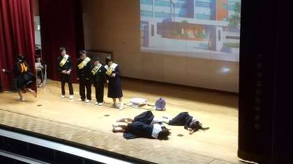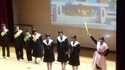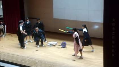 生徒会の発表です。あいさつをめぐって悪と善が戦うというストーリーの演劇です。