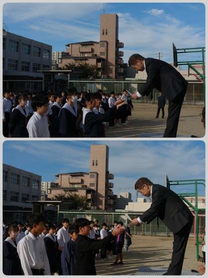 本日の全校集会では、後期の役員が選出されたので、認証式を行いました。後期の生徒会役員と各学年1組の委員長が代表して認証状を受け取りました。また、校長先生からは、来週に控えている3年生の進路懇談やテストについて、平賀先生からは休み時間の過ごし方について話がありました。気候も大分涼しくなってきています。体調管理をしっかりしましょう(^o^)