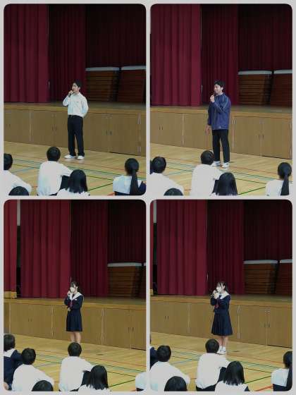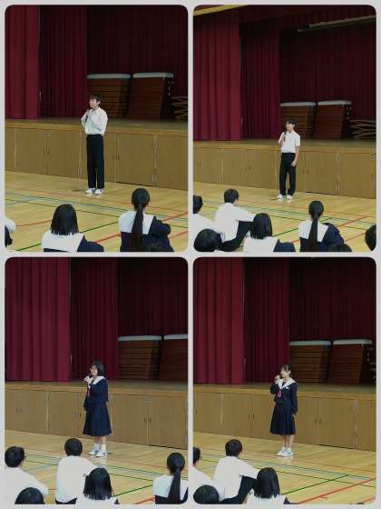 本日の集会では、今週の火曜日に認証式で認証された後期の委員長達がそれぞれの意気込みを発表してくれました。また、学年主任からは来週から進路懇談をむかえるので、普段の授業や休み時間の使い方など再度見直してみようと話がありました。みんなで頑張っていきましょう(^o^)