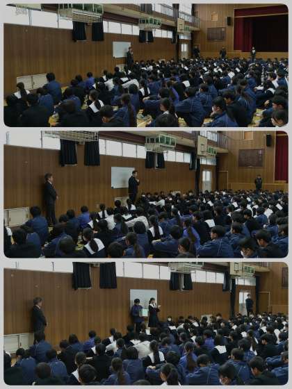 本日の全校集会では、校長先生から今週の木曜と金曜に3年生は学年末テストがあり、進路に向けて頑張ることや1・2年生は「百人一首大会」