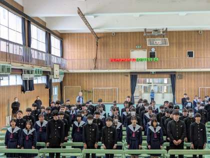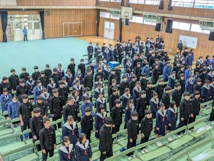 国歌、市歌、校歌斉唱です。