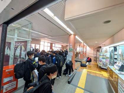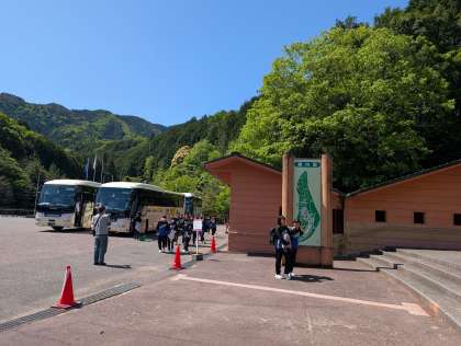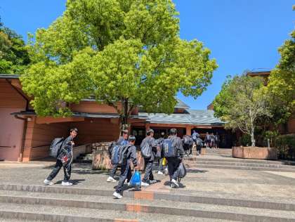 9時55分.大阪府立少年自然の家に到着しました。バスを降り体育館に移動、ここで入所式を行います。