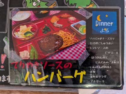 館に戻った後入浴。昼間の汗を流しました。 18時からの夕食メニューは「てりやきソースのハンバーグ」です。