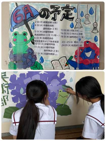 来週から6月ということで、予定表と保健室前の壁面装飾を入れ替えました!