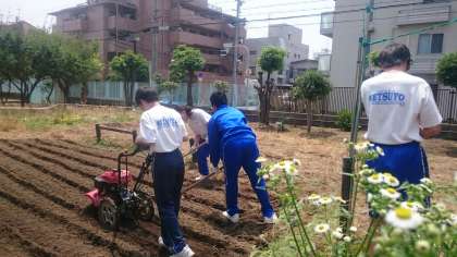 園芸部は土を耕し、畝を作り、月曜には苗を植え付けます。