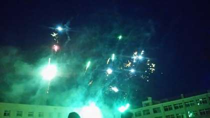 演奏後は校庭で小学生といっしょにカレーライスをいただき、キャンプファイヤーにも参加し、打ち上げ花火を鑑賞しました。