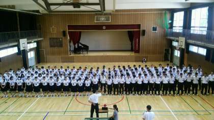 現地では屋外で歌うことになりますが、平和への願いがしっかりと届くようにと、体育館に集まって学年全員で二部合唱の練習をしました。最初は声の出があまり良くありませんでしたが、何回か歌いこむうちに気持ちが乗ってきて、声も良く出るようになってきました。本番は一発勝負ですが、それはこれから直面していく入試も同じです。体育大会の集団演技も見事に決めてくれた70期生なら、きっと良い歌声を響かせてくれることと思います。