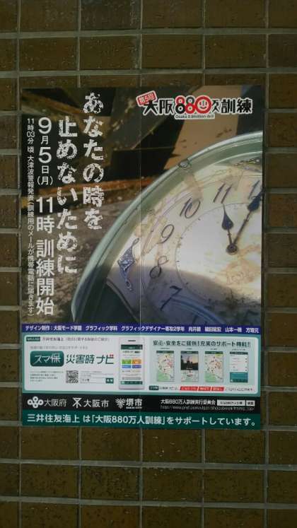 今日は大阪880万人訓練の日でした。11時に「訓練・緊急地震速報 強い揺れに備えてください。」と2回のアナウンスが流れ、机の下に隠れて身を守ることなどを確認しました。