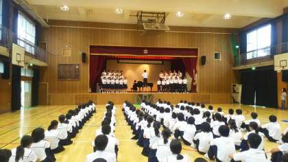 本日の6時間目、2年生は16日金曜日に行われる合唱コンクールのリハーサルでした。本番当日は各クラスとも課題曲と自由曲の2曲を合唱し、その総合点を競いますが、本日は時間の関係上、課題曲だけを通し、自由曲については前奏部分の確認と最後の礼の仕方の確認をしました。