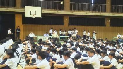 さて各クラスの発表が終わり、審査結果の集計待ちとなりましたが、そのドキドキの時間を利用して、文化祭当日に全体合唱する「栄光の架橋」を5クラスみんなで歌い、保護者の方に聴いていただきました。