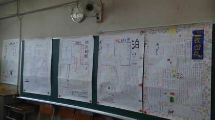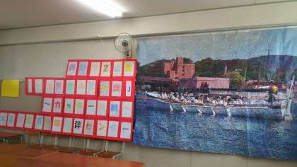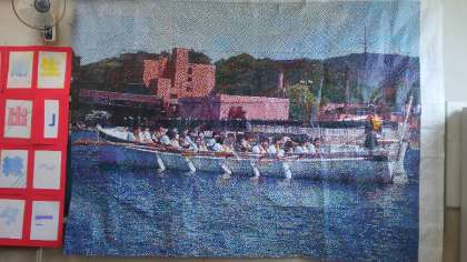 1年生は一泊移住のについてです。こちらもモザイクアートで、海上でカッターに乗っている様子が表現されています。こちらも緻密に作られています。