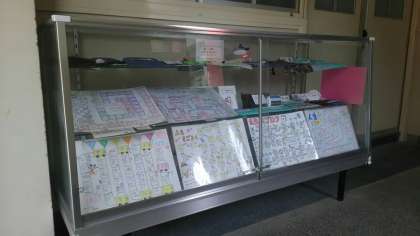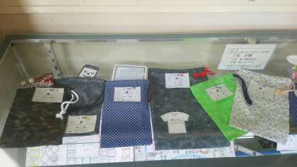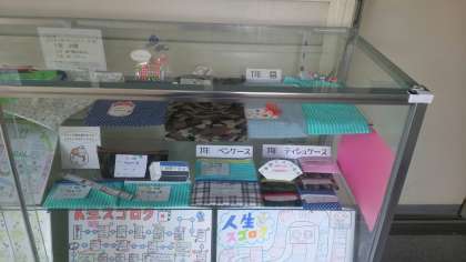 北館校舎の1回のガラスケースに家庭科の授業で作製した作品が展示してあります。