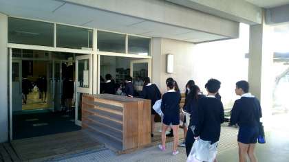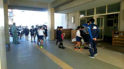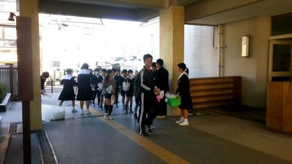 午後2時前にまず、喜連西小学校6年生が中学校にやってきました。それから数分後、平野南小学校6年生もやってきました。生徒会役員の人たちが靴を入れる袋を手渡しながらお出迎えです。