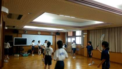 多目的室では、女子バドミントン部が活動していました。ラケットを振るには手狭でしたが、交代でラケットを使っていました。
