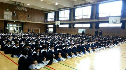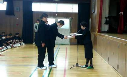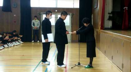 終業式に引き続いて柔道部の伝達表彰を行いました。1年生男子部員2名が表彰されました。
