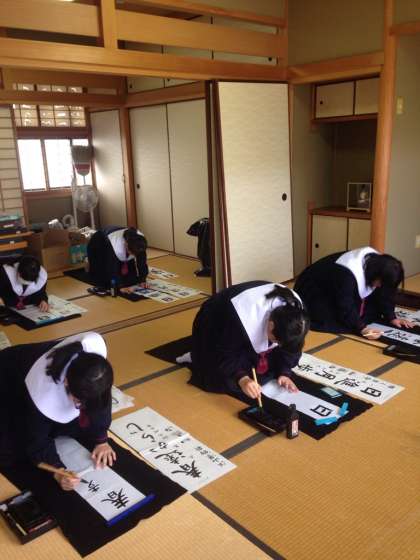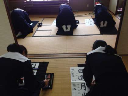 書道部の人たちは和室で半紙に思い思いに筆を滑らせ、今年最初の筆の感触を楽しんでいました。