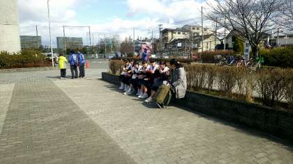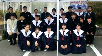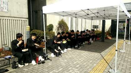 演奏後の記念撮影と、仲良くお昼ご飯を食べている様子です。演奏後は雪のような雨が降っていましたが、お昼は晴れていました。