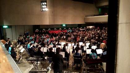 ラストの合同演奏の様子です。平野区各中学校の2年生が演奏したのは「エベレスト山」と歌も入って「花は咲く」でした。大人数による迫力ある演奏が聴けました。