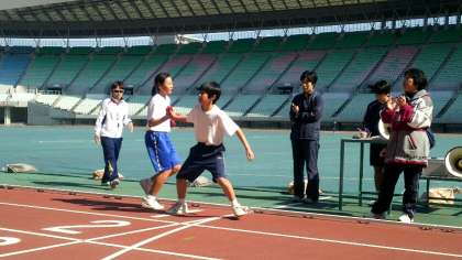 颯爽とスタジアムから出てくる様子、タスキを外す様子、タスキをつなぐ様子。