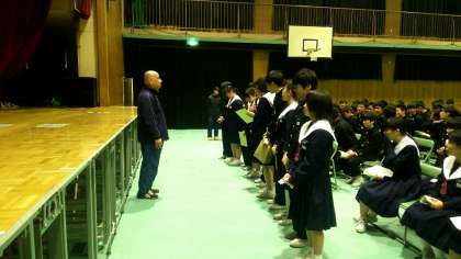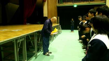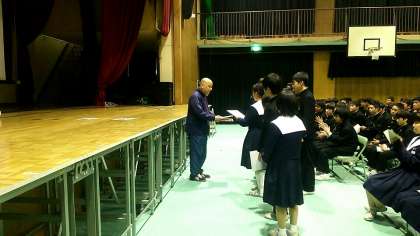 学年集会の最後は3年生を代表して各クラスの委員長が、学年主任の河野先生に寄せ書きの色紙を手渡しました。