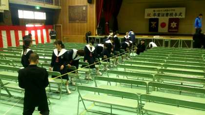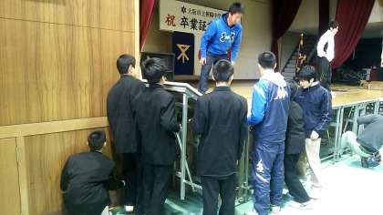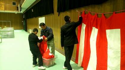 長イスはメジャーを引いて列を整えたり、張り出し舞台を設置したり、紅白幕を取り付けたりと大忙しでした。