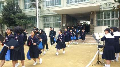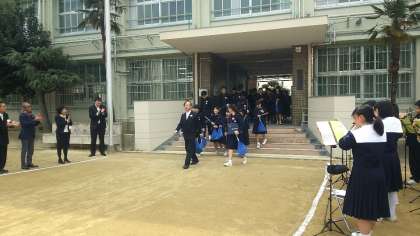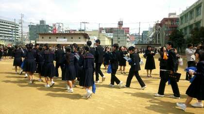 卒業生が通り抜ける花道の両側には保護者の皆様方が。