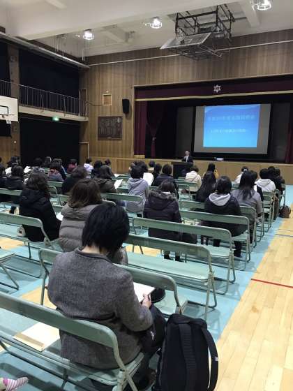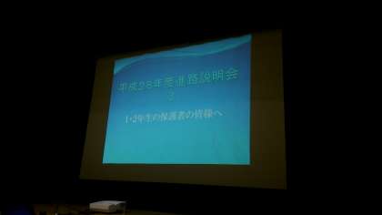 昨年度から公立高等学校入学者選抜の方針が大きく変わり、またチャレンジテストや大阪市統一テストがどのように評定と関わるのかということを知っていただくために、1・2年生の保護者の方を対象としてこの時期に進路説明会を実施しています。