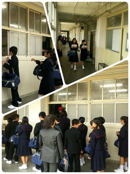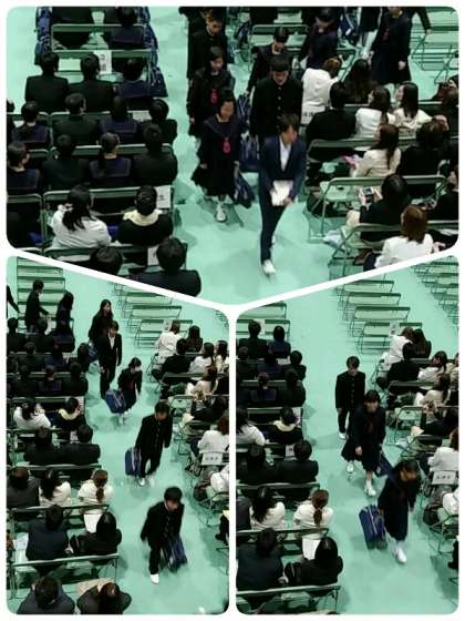 新入生が体育館から退場。 新しい教科書を途中で受け取り、教室へと向かいました。