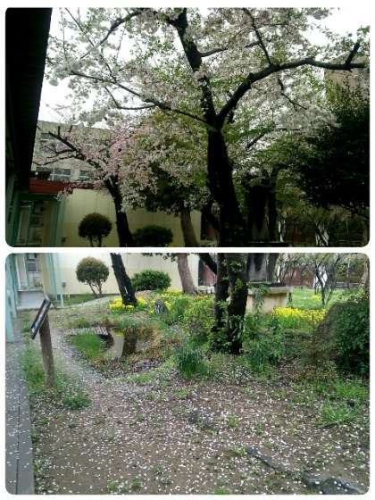 そして、ビオトープの桜も昨日より更に花が散った模様です。枝からは葉も顔を出し、始業式までもってくれたらいいのになあ…という状況です。
