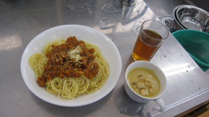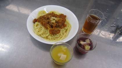 ミートスパゲッティとコーンクリームスープとフルーツゼリーです。美味しくできあがりました。