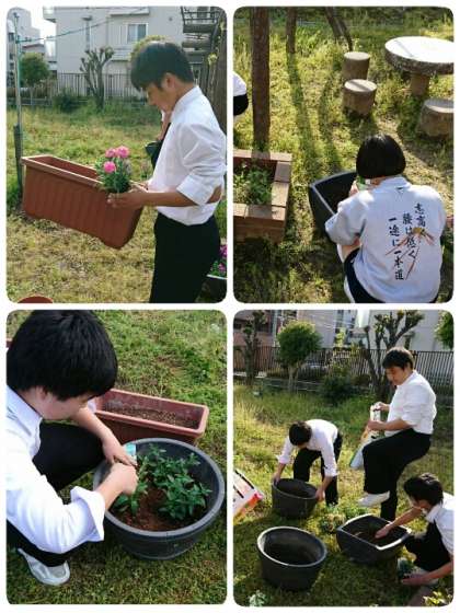 お花は正門付近に色合いを考えてきれいに並べてくれました。登校してきたらまず目にすることができ、心安らぐのではないでしょうか。