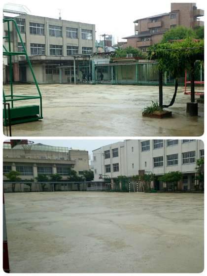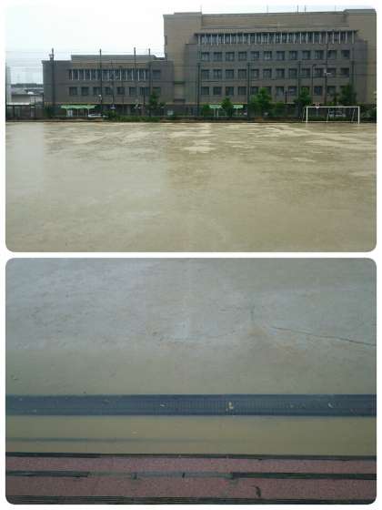 中庭も北グラウンドもご覧の状態で屋外で活動する運動部にとっては悩ましいところです。