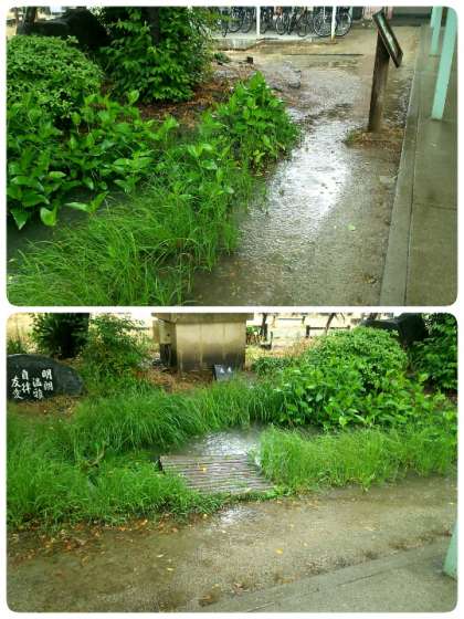 ビオトープの池も増水して、池から溝の方に流れ出しています。メダカが流されないか心配です。