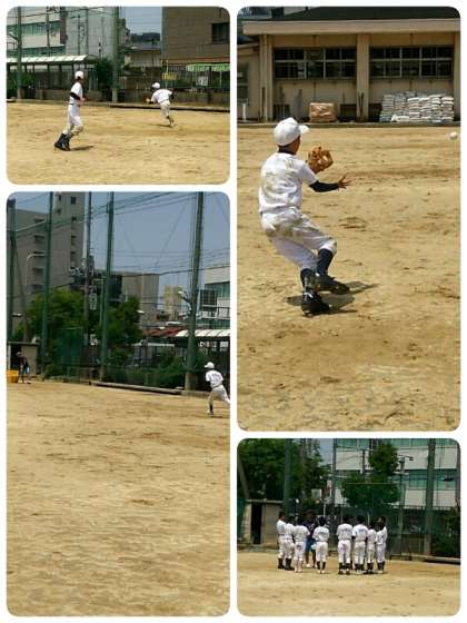 溝掃除の後、グラウンドに目を向けると野球部の人たちがノックを受けていました。みんなドロドロになりましたが、その後も元気に練習していました。