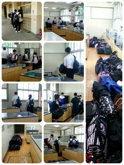 1・2時間目は授業をするので、3・4時間目の事前指導まで修学旅行用の荷物は調理室に置きました。
