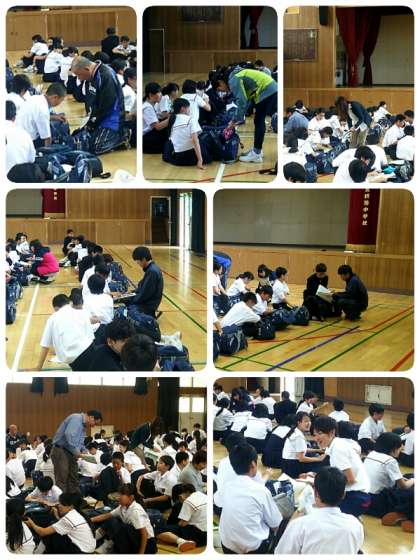 当日持っていく荷物をそのまま持って登校し、その中身を点検していきました。
