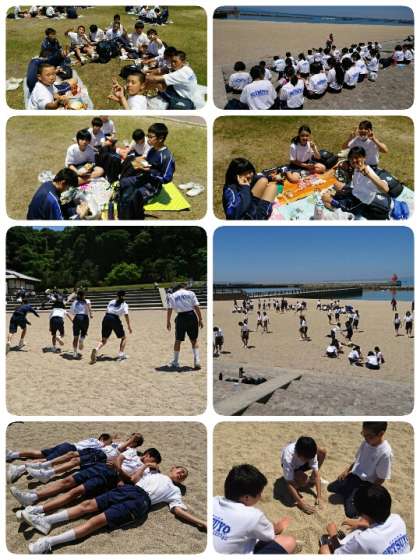 その後、砂浜で走り回っています。砂で山をつくっている人もいます。